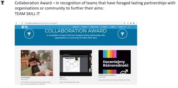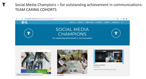 Two teamswere declaredthe winners of the GSLGlobalGoalsCompetition 2020-21 and achieved Commendation Awards incategories ofSocial Media Champions (TEAM Caring Cohorts)andCollaboration Awards (TEAM SKILLIT)for outstanding achievement in communications and in recognition of teams that have foragedlasting partnerships with organizations or community to further their aims respectively.
