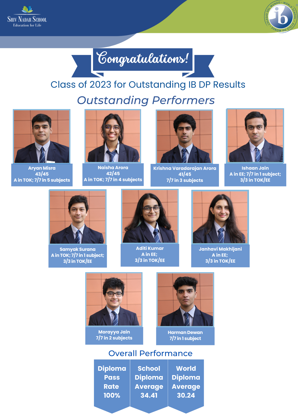 We heartily congratulate all our IB DP students and teachers of the 2023 cohort for their hard work and sustained efforts against all odds. We would like to thank the parents and grandparents for their continued support and encouragement during this rigorous two-year journey.