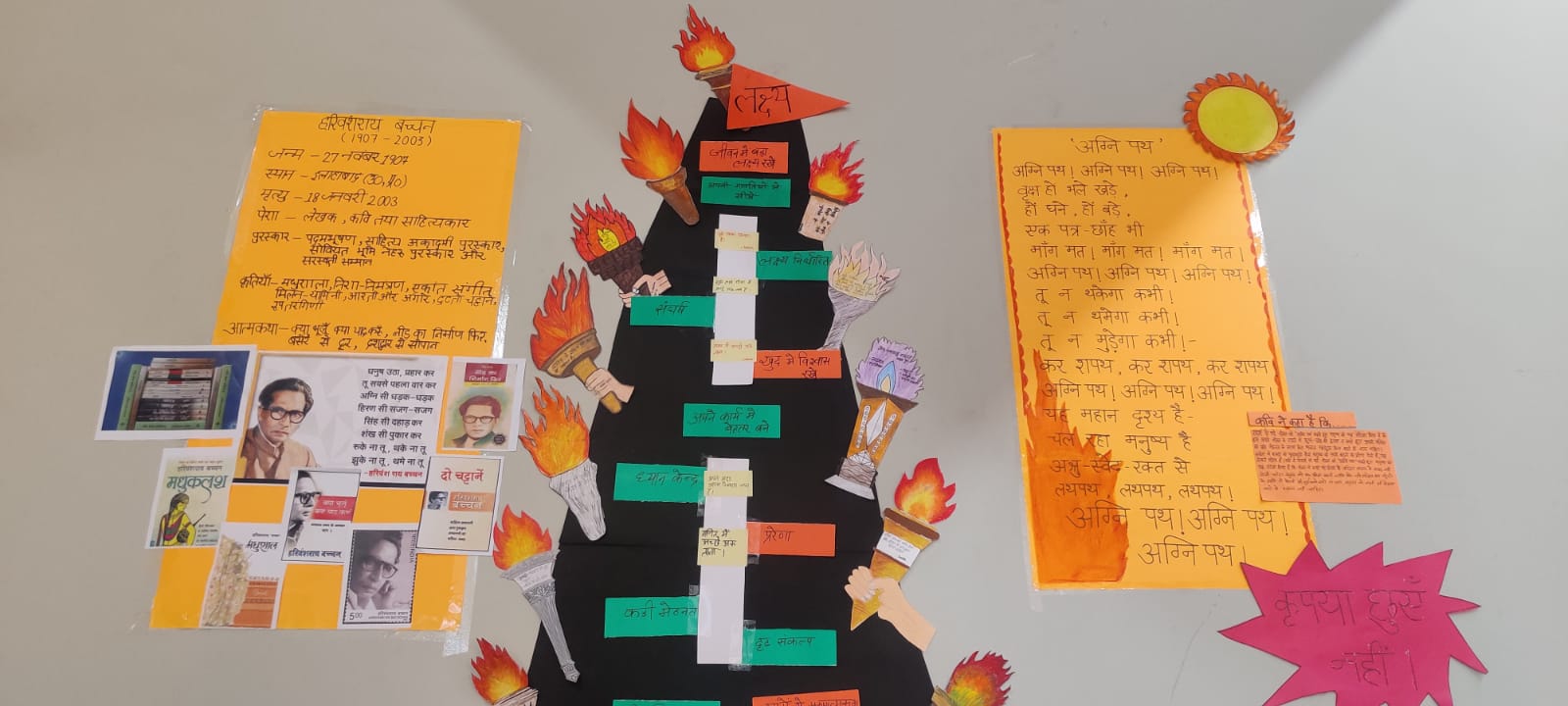 जिसके प्रारम्भ में छात्रों ने सर्वप्रथम अपने लक्ष्य को निर्धारित करते हुए स्टिकी नोट पर अपने जीवन का उद्देश्य लिखकर हरित पट पर लगाया । तत्पश्चात उन्हें उस उद्देश्य को प्राप्त करने के मार्ग में आने वाली बाधाओं से मौखिक चर्चा के माध्यम से अवगत कराया गया । छात्रों ने बहुत ही मार्मिक ढंग से अपने विचारों को कक्षा के समक्ष व्यक्त किया। जब छात्रों को कविता से अवगत कराया गया तब वे अपने लक्ष्य तथा लक्ष्य प्राप्ति के मार्ग को अग्निपथ के माध्यम से समझ पाए । साथ ही उन्होंने अग्निपथ शब्द का अर्थ अपनी समझ तथा अनुभव के आधार पर व्यक्त किया| कविता के पठन,समझ तथा अर्थ ग्रहण के पश्चात छात्रों को अग्नि पथ के मार्ग हेतु एक मशाल बनाने के लिए कहा गया। जिससे वे अपने अग्निपथ को रौशन करते हुए तथा चुनौतियों का सामना करते हुए अपने साथ रख सकें। छात्रों ने इस कार्य को ध्यान में रखते हुए मशाल का निर्माण किया, उसपर अपनी चुनौतियाँ तथा बाधाएँ लिखीं तथा उसे एक दीवार पर बनाए गए अग्निपथ रूपी मार्ग पर जाकर लगाया।जिसे छात्रों ने बहुत ही रूचि के साथ पूरा किया ।