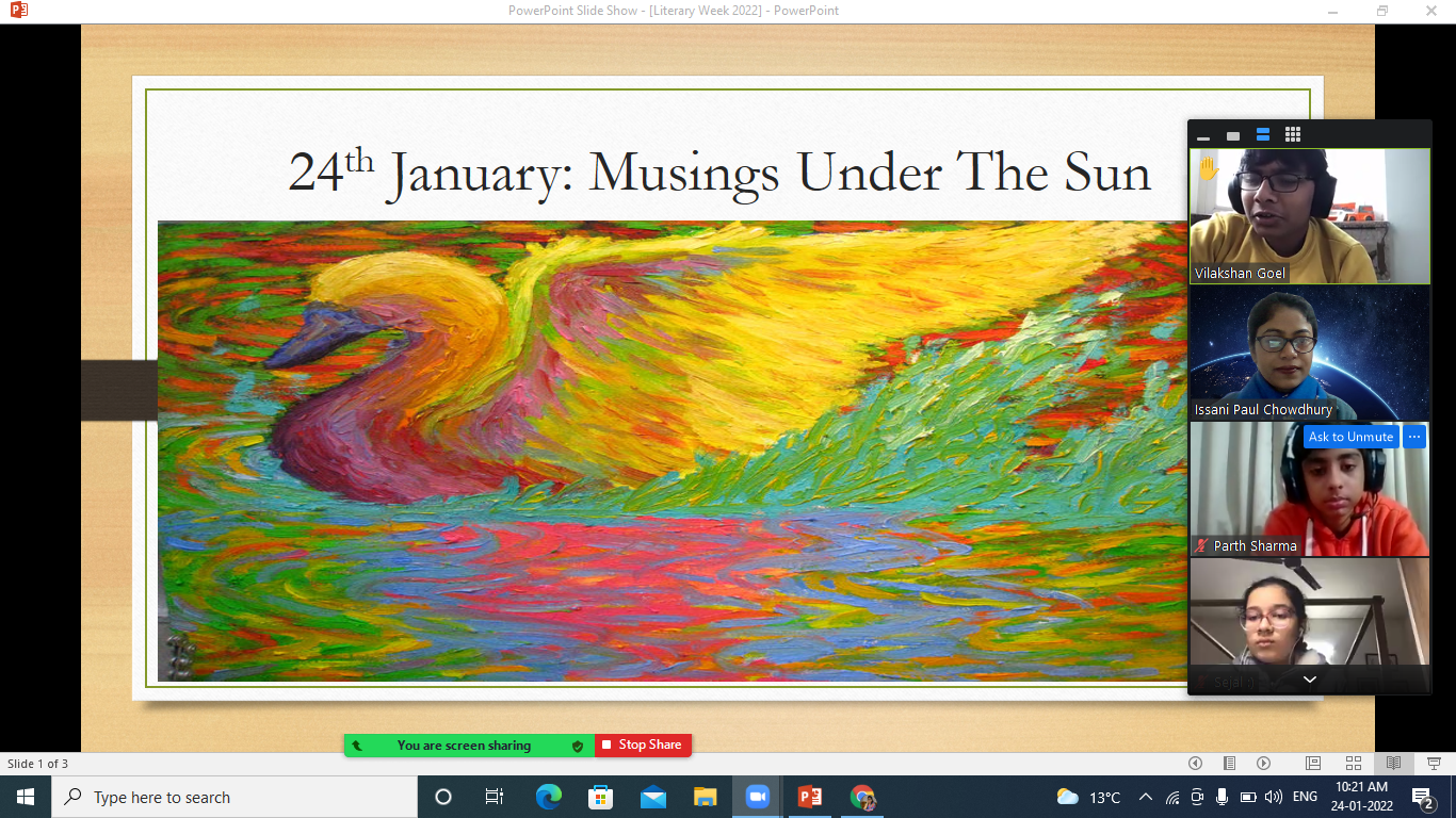 Grade 11 learnt how to write Haiku poetry when Ishaani ma’am and Mitu ma’am took a session with them. Haiku poetry is an entire poem in three lines with five syllables in the first line, seven in the second, and five in the third. Many eleventh graders were inspired to write Haiku poetry and also did haiku jam on an app for Haiku. They shared their haiku poems and enjoyed thoroughly.