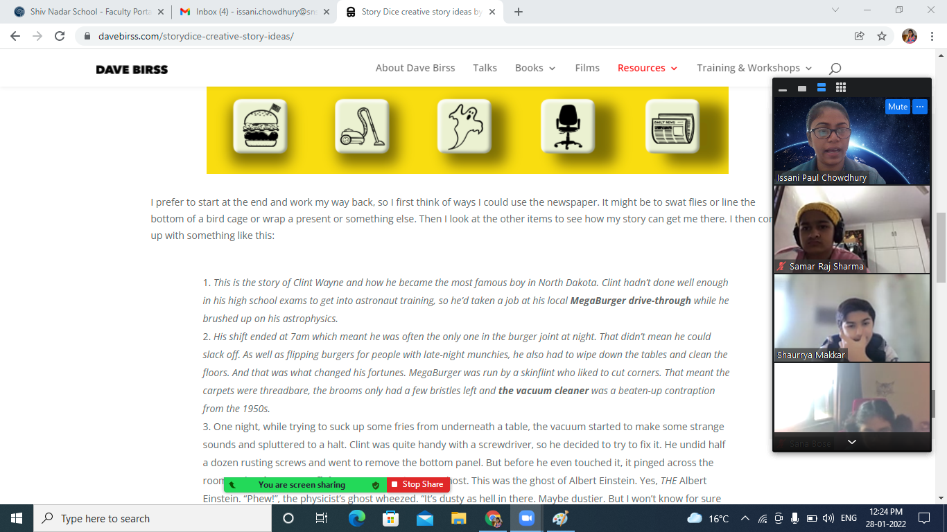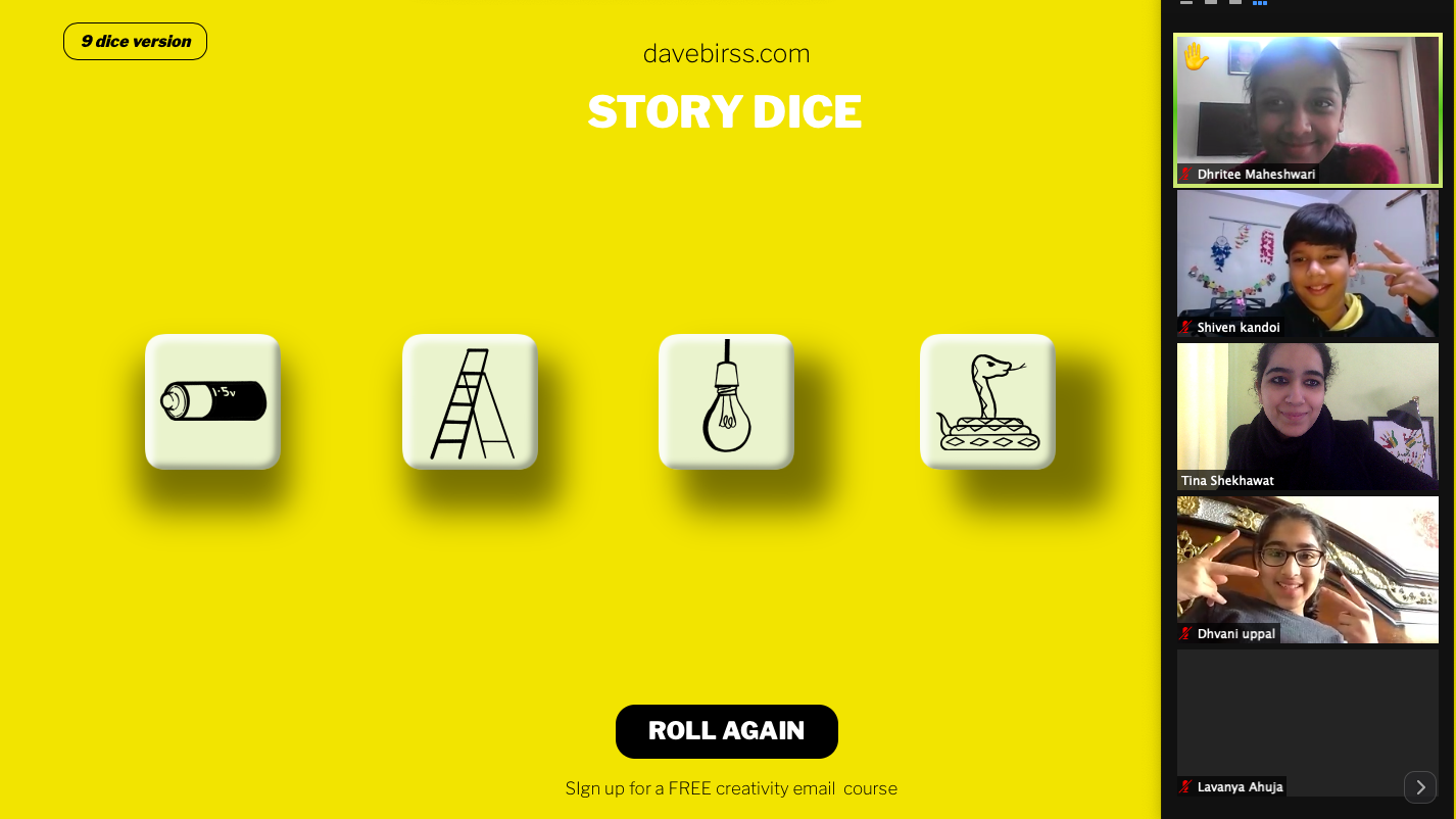 Story Dice, the final activity of the week, was a novel experience for the students. In groups, they rolled the dice and brainstormed the prompts to weave beautiful and interesting stories.
