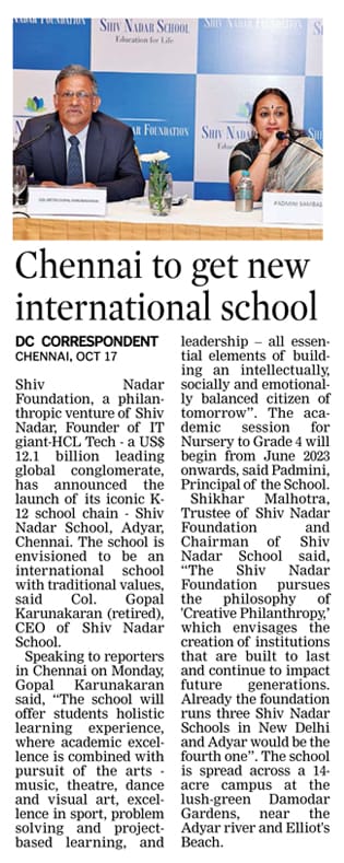 Shiv Nadar Foundation has announced the launch of Shiv Nadar School in Chennai, which is envisioned as an international school with traditional values. Reaffirming the Foundation’s deeply rooted commitment to education, the school is affiliated with the International Baccalaureate (IB) Board. It would offer world-class education for the holistic development of young learners. Around 150 students will be enrolled in the first year of operations, and the intake will progressively increase every year.