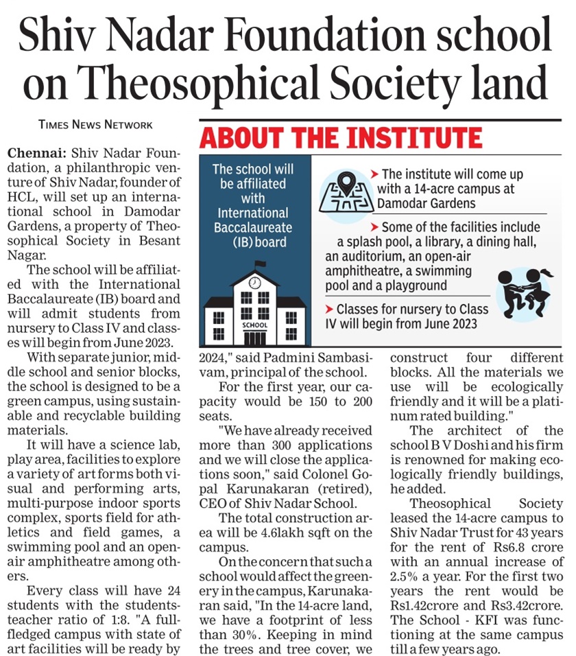 Campus Infrastructure and Facilities: The school is spread across a 14-acre campus at the lush-green Damodar Gardens, near the Adyar river and the famous Elliot's Beach. The site is well-known in Chennai for its greenery and tree cover, and the school is taking all possible measures to ensure that the ecological balance is not disturbed and will be enhanced with more trees and plants. It is designed by award-winning architects from Vastu Shilpa Consultants, a firm founded by Padma Bhushan awardee Mr. B.V. Doshi, known for creating ecologically sustainable architecture. The campus would enable learners the spirit of inquiry, a love for nature, and an environment for community building.