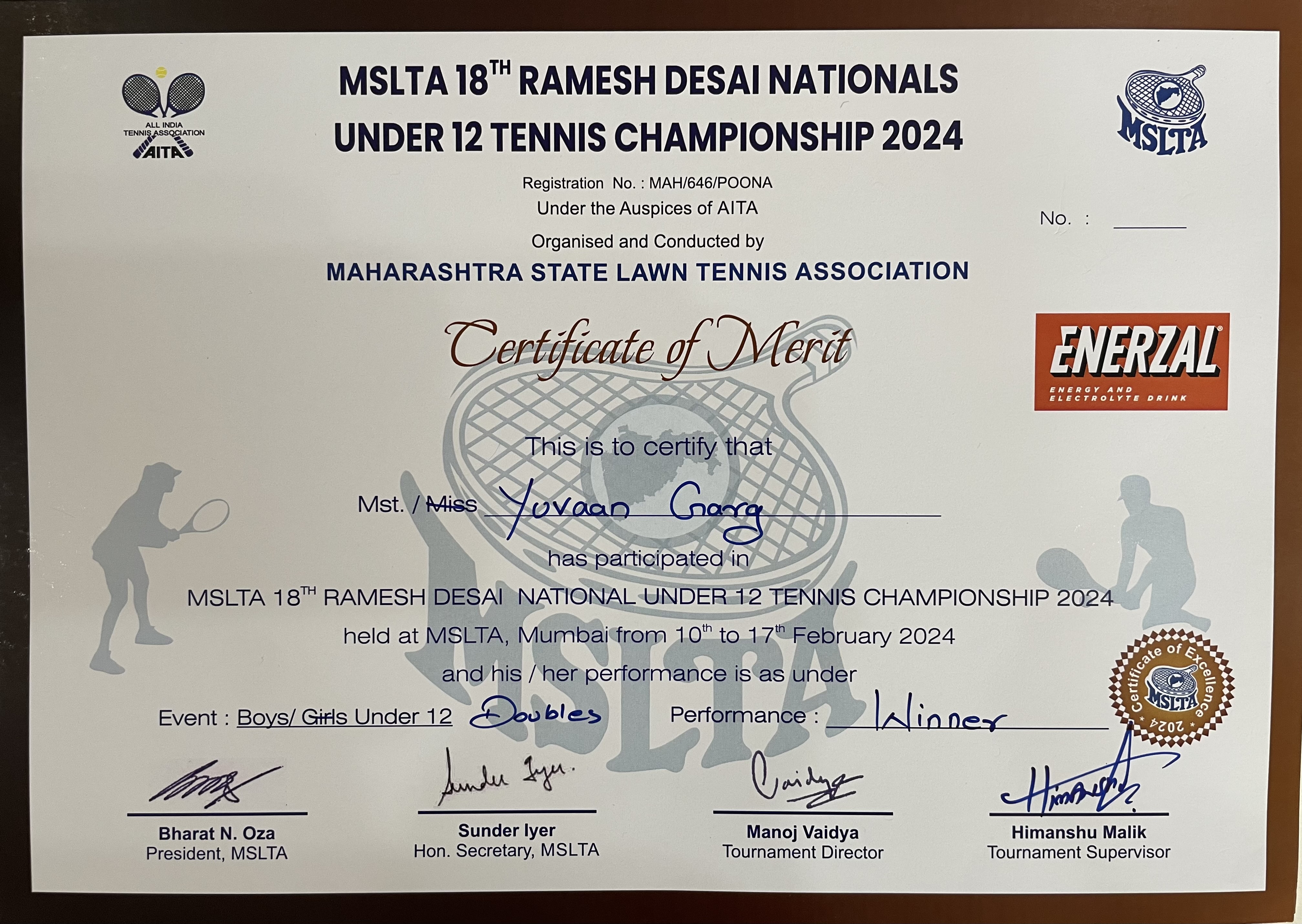 Yuvaan has triumphantly claimed the prestigious title of NATIONAL CHAMPION, showcasing his exceptional skill and dedication by clinching the Doubles Title at the renowned NATIONALS UNDER 12 TENNIS CHAMPIONSHIP held in Mumbai from February 2024.